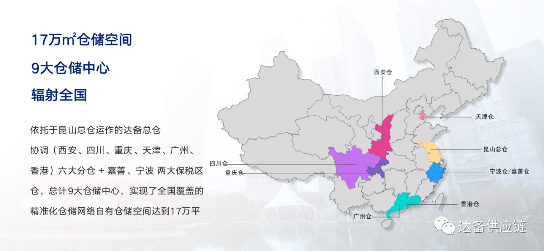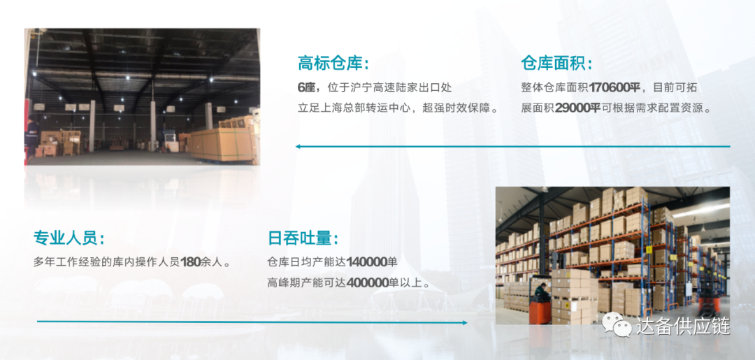 达备供应链——全供应链服务商![]() 达备依托长三角高效物流资源及品牌运营的核心优势;核心业务为面向企业客户打造集成: 全网入仓、货物运输代理、一件代发、云仓服务、商品再包装、品牌代理经销、自有品牌孵化、企业定制等八位一体的一站式全网供应链服务方案。 01、物流仓储:数据驱动 全国覆盖