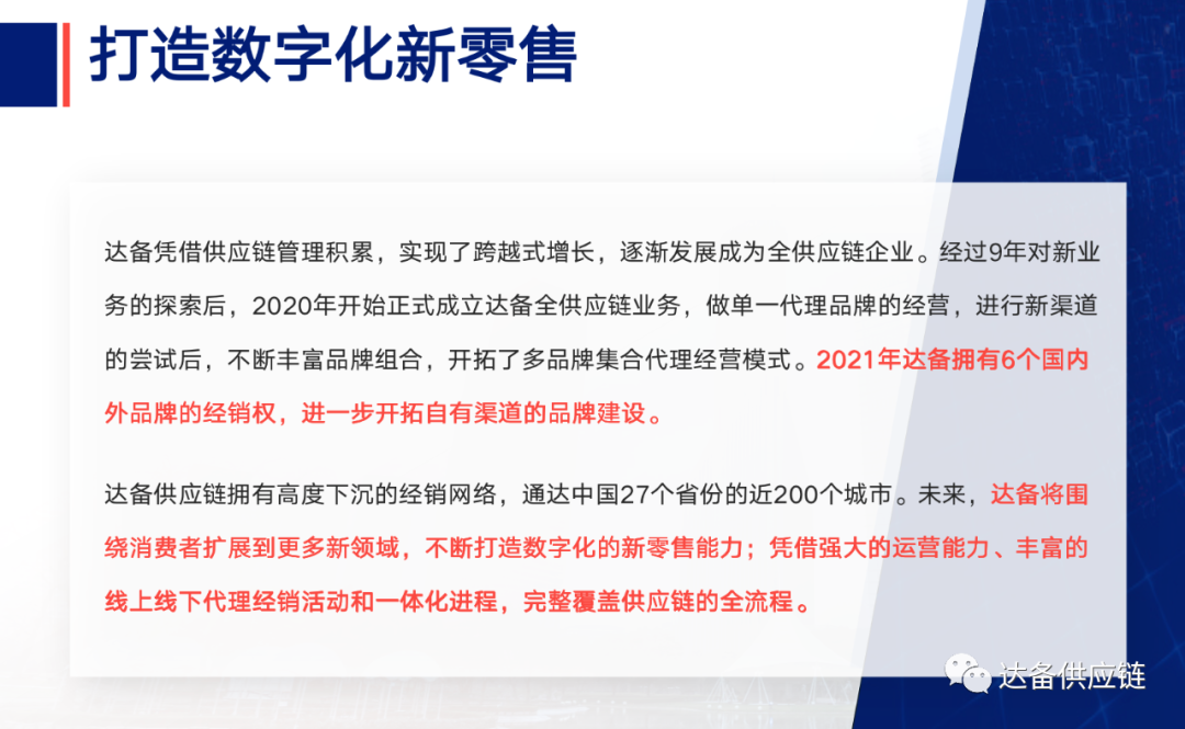 ![]() (全网入仓&仓配一体&快递服务) 02、经销代理:选品独到 渠道通达 ![]() ![]() ![]() ![]() 随着商业运营效率及服务体验需求升级,国外零售品牌正逐步进入中国全渠道分销阶段,达备与国内67+零售平台,2000+分销伙伴达成战略合作,截止目前,为74个品牌客户提供: 中欧班列、海陆联运、保税仓、国内分销、国内仓储与配送等为一体的一站式进口分销供应链服务。 达无阻,备无忧。 |
